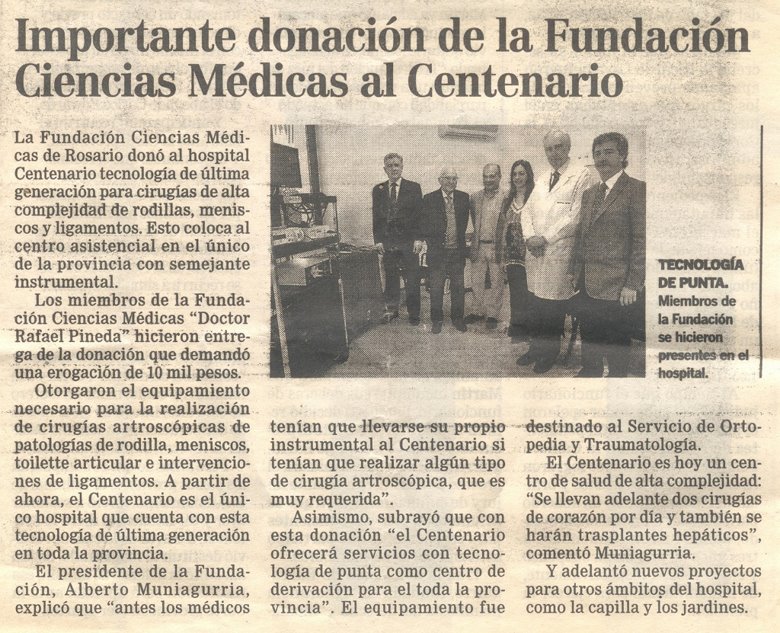 La misma consiste en instrumentos de cirugía y accesorios como soporta muslos, manguitos de hemostasia, y demás, con un valor de la donación que alcanzó los 60.000 pesos.Se realizó un acto para recibir la donación por el hospital junto a los encargados de los servicios y directivos del Hospital del Centenario.