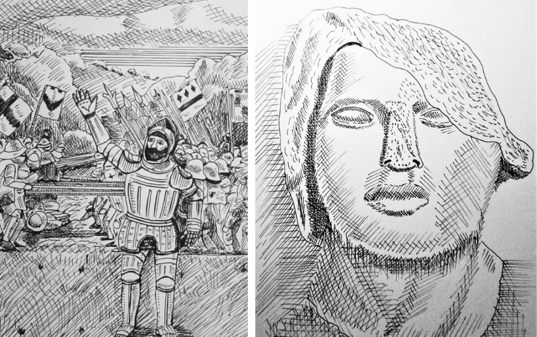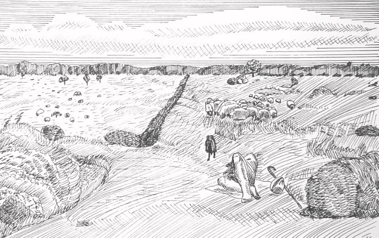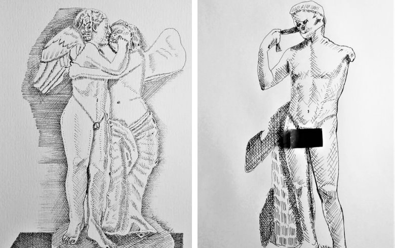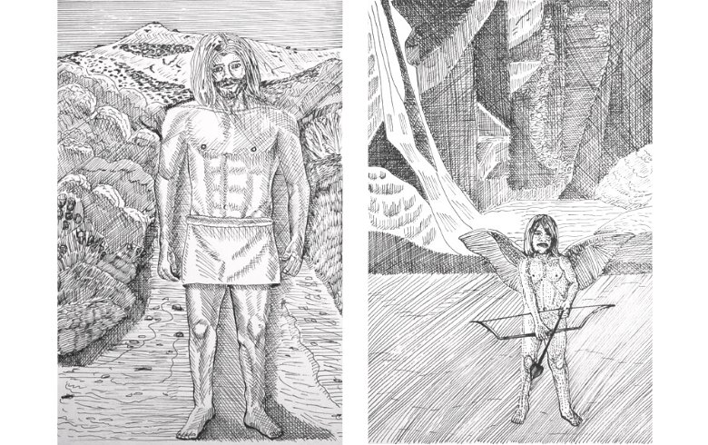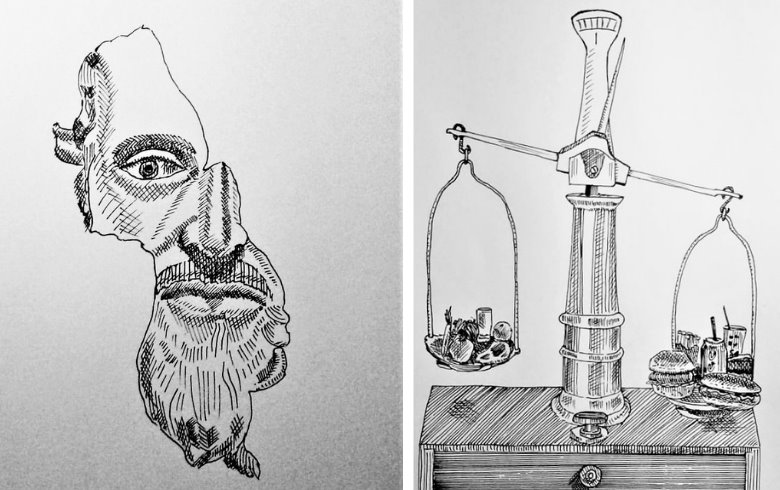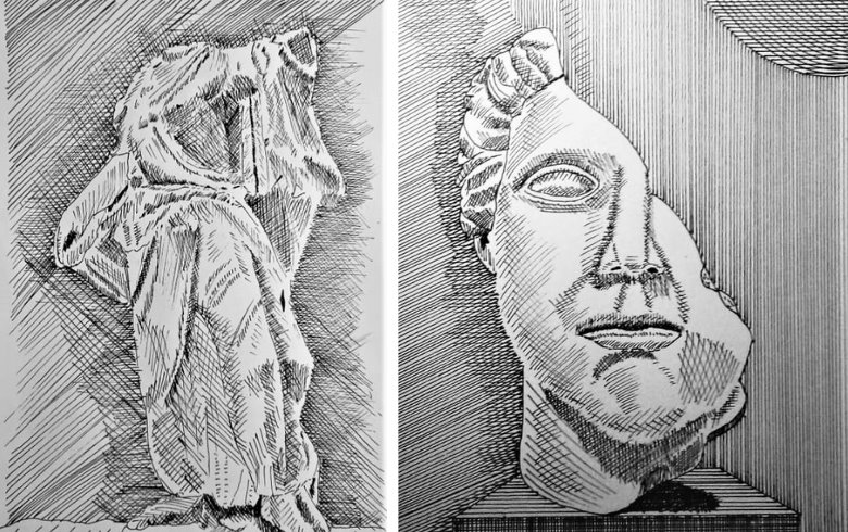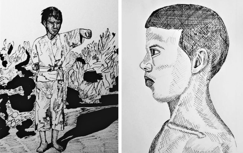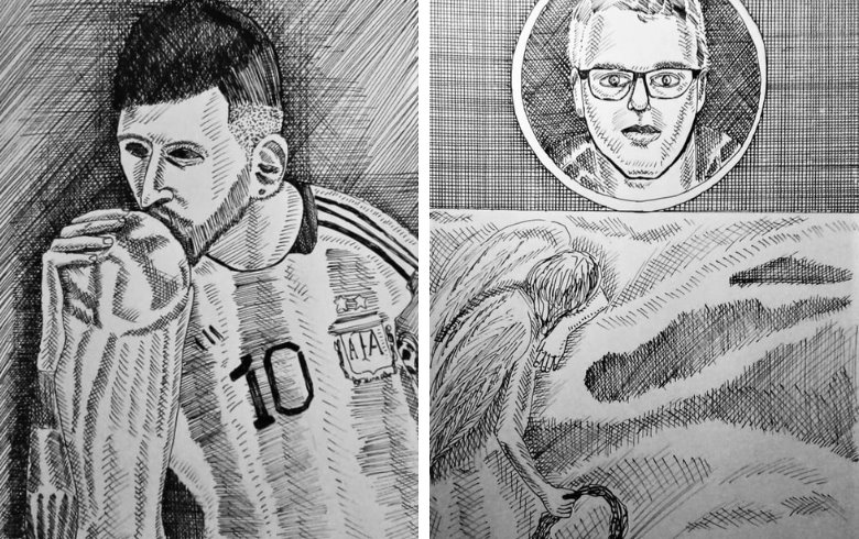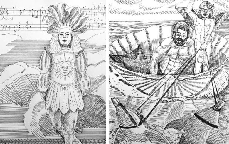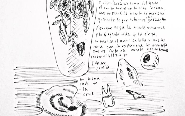 Realiza dibujos, escribe poemas y hace interpretaciones de música clásica con instrumentos de viento.Trama, textura y creatividad. Tinta china sobre papel A4 150 gramos con isógrafo Rotring.