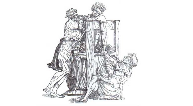 Figura 10: Xilografía que representa la reducción de un hombro luxado con un dispositivo descrito por Hipócrates.