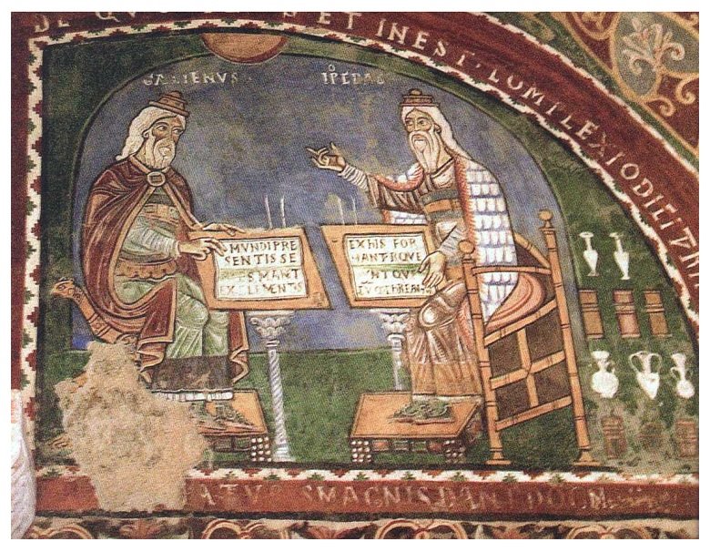 Figura 13: Mural del sigro XII de la Catedral de Anagni (Italia) en el que aparecen representados Galeno e Hipócrates